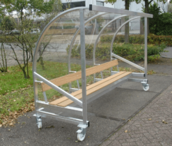 Een dug-out met holkamer platen aan de achterkant. Zijkanten zijn uitgevoerd met 3mm polycarbonaat beplating. Ideale dug-out om iedereen beschut te laten zitten voor de regen! De dug-out wordt standaard volledig gelast geleverd en is uit speciale aluminium profiel opgebouwd.