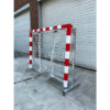 Dit vrijstaande handbaldoel met inklapbare netbeugels is uitgevoerd in een speciaal aluminium profiel 80×80 mm met afgeronde hoeken voor extra veiligheid. Het doelkader heeft ingefreesde nethaken, is standaard rood/wit en is optioneel leverbaar in andere kleurstellingen.